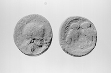 | Description: | Sv. 24.51--57. [θ Kleiner 1975, p. 321, pl. 75, no. 298 (misclassified). (M--N 15:1); the small Athena heads and chunkier fabric of Agora XXVI, nos. 46h-k set them apart from the normal examples of variety Agora XXVI, no. 46. One or more might be Attic-helmet variants of the 3rd-century variety Agora XXVI, no. 56 (Corinthian helmet/Two owls, (?)greek letters(?)), although, as we have seen from the otherwise normal Agora XXVI, no. 46g, the vertical arrangement of the ethnic is not necessarily indicative of later issue] Athena head right, Corinthian or Attic helmet. Two owls in olive wreath. Between owls ΑΘ. Worn. | |