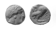 | Obverse: | Head of Athena r., wearing Attic helmet ornamented with palmette and olive leaves; eye of Athena rendered in full profile. | |