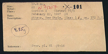 | References: | Publication: Agora XXVI Publication Page: Agora 26, s. 89, p. 63 Publication Page: Agora 26, s. 376, p. 350 Publication Page: Agora 29.1, s. 590, p. 551 Deposit: N 18:3 Notebook: Χ-2 Notebook Page: Χ-2-15 (pp. 220-221) Notebook Page: Χ-2-31 (pp. 252-253) Card: Χ-101 |