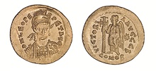 | Reverse: | VICTORI-A AVCCC B Victory standing l., holding long cross in r. hand. In field r., star. In exergue, CONOB | |