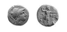 Obverse:   Head of Athena r., wearing Corinthian helmet. Border of dots.