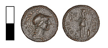 | Obverse: | Head of Athena r., wearing composite helmet. She occasionally wears a necklace. Border of dots. | |