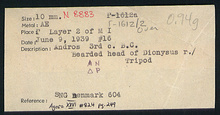 | References: | Publication: Agora XXVI Publication Page: Agora 26, s. 275, p. 249 Publication Page: Agora 26, s. 305, p. 279 Publication Page: Agora 26, s. 363, p. 337 Image: 2012.74.0725 (84-4-40) Deposit: D-E 15:1 Cards and Envelopes (4) |