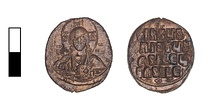 | Obverse: | [+&AG1;&AG9;&AG9;&AG10;NO&AG7;]HΛ Bust of Christ, bearded, facing, wearing nimbus cr. (with ornament in each limb of cross), tunic and mantle; r. hand in benediction, l. holds Book of Gospels (with ornament on cover); in field l. and r., &MG9; &MG10;. Border of dots. | |