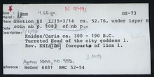 | References: | Publication: Agora XXVI Publication Page: Agora 26, s. 299, p. 273 Publication Page: Agora 26, s. 363, p. 337 Image: 2012.77.1713 (91-4-9) Card: ΒΖ-73 |