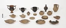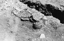 Concentration of artifacts, small pieces of bone, and burnt material in stratum, no pit discerned. The pyre is cut by the trench of a wall of a Roman house to north. It was found in digging "Hellenistic" fill; no further information about the stratigraphy or about the pottery from that fill is available. although the pyre was apparently not burnt in situ, the objects lay in a compact mass, not much disturbed, and they are mostly complete.
