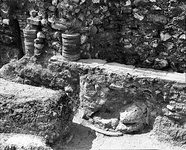 | Description: | Large tile-lined well in SW Bath, Room A4. The top had been sealed with ca. 1.30m of concrete, and the floor to carry the hypocaust columns of the room in Phase C had been carried over it. The well was ca. 1.30m in diameter, with four tiles 0.65m high making up the circumference, each carefully clamped with three lead clamps to its neighbor. Homogeneous fill throughout with little pottery and a great many broken fragments of roof tiles. The good, careful construction, the date of its filling, and its large size would all seem to indicate that the well is probably to be associated with Phase A of the Bath. | |