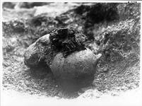 | Description: | Grave 1. Urn cremation (trench-and-hole), adult female 30-40 years old). Mentioned as Grave XVII in Deposit list. Consisted of a roughly circular pit, approximately 0.30-0.40m in diameter, cut into soft bedrock against the face of an outcrop of natural rock, described by the excavator as limestone, to a depth of about 0.35m. P 325 served as cinerary urn and was placed upright within the pit and firmly fixed in place by small stones packed tightly around the amphora from shoulder to mouth. Virtually nothing of the pyre trench survived, but it's presence was indicated by hard red-colored burned earth packed tightly against the rim of the amphora along the northwest side. A few remnants of a stone packing beside the urn-hole, on the north side, probably once continuous with the packing around the urn, contained a few burned sherds, clearly pyre debris. Also P 345 from sifting earth around grave. See also P 34860-P 34866 catalogued as "sherds overlying tombs F 16:3 & F 16:4". | |