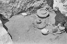 | Description: | Sacrificial Pyre I, Classical Building II. The pyre was set through the original floor level of the northern room of the Classical Building and apparently is the remainder of a ritual conducted when the old floor was raised. The pyre was preserved in a thin strip of undisturbed fill between Pithos III and a Byzantine pit. Bits of bright blue and bright red pigment were found in the fill around the vessels. | |