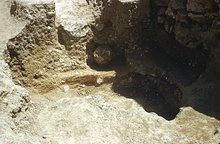 The western part of the offering trench of the tomb was lost to a Turkish cess pit, and disturbances at least as early as the 7th c. B.C. had cut away the upper part of the cinerary urn and the adjoining trench filling. The tomb was found directly below a Classical wall. What survived was the south and east section of the original grave, including a strip of the pyre trench, reddened from burning to a depth of 0.05m, and below it a shallow urn-hole, roughly square, ca. 0.60m to the side, cut through earth almost to the level of bedrock, to a depth of about 0.30m.