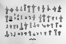 | Description: | Circular pit and irregular cutting north of it. Diam. of pit ca. 0.80m; Dimension of irregular cutting ca. 1.00x1.20m. The pit was dug into bedrock and filled with red earth which was packed with undisturbed pottery. On top were small sherds and broken figurines; below were stacked skyphoi, mostly on east side. At the bottom was a filling of earth and small stones. The pit was well-cut, perhaps as a bedding for a pithos. The irregular cutting contained a similar filling but the pots were stacked, not dumped. The presence of ochre, of trial pieces and of lumps of burnt clay suggest that both cuttings contained refuse from a nearby workshop. This was probably the same establishment to which the well R 17:5 belonged. | |