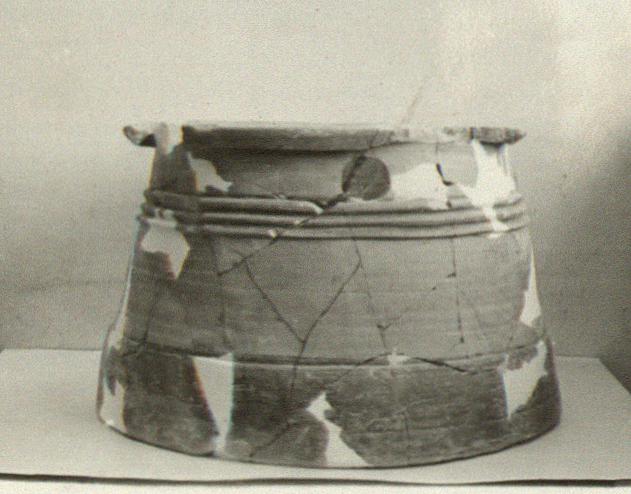 | Description: | Mended from many fragments and restored in plaster. Projecting rim turned down on one side of wellhead, flat on other. Two circular hand-holes below rim, then three ridges. Glazed, slightly raised band around bottom of side wall. Clay brown to dark gray. Cf. A 957 (ΟΑ 692). Cf. P 8887 (ΗΗ 309), a well head from well in section ΗΗ at 51/ΛΖ. | |