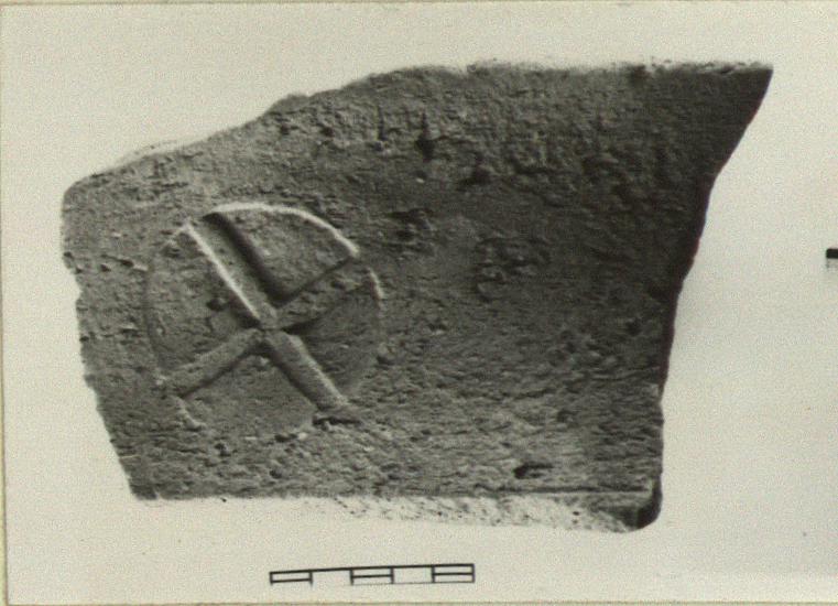 | Description: | Part of a convex cover tile, with some of one edge preserved. Dull reddish glaze outside only. Inside, a large circular stamp: four-spiked wheel(?). Fragments of several others with similar stamps in Tin 702. | |