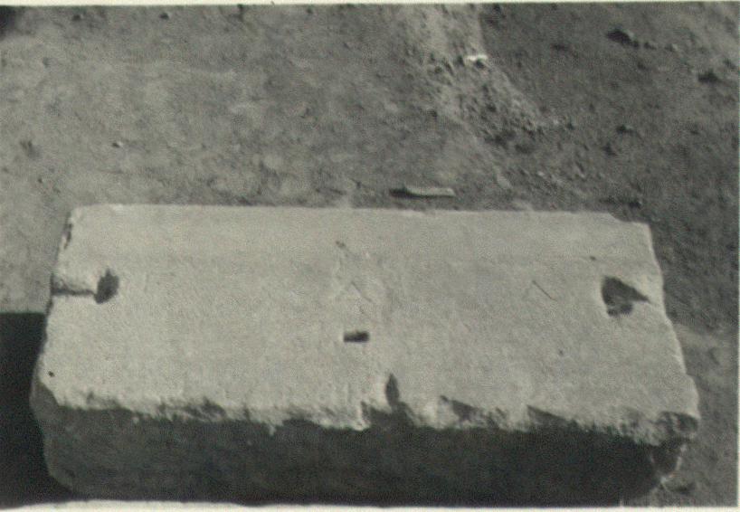 | Description: | Finished with anathyrosis on both ends. Of the front, the lower part is left rough, the upper rough-picked but surrounded by a smooth band. On the top, a setting line 0.155m. back from the front; in front of this line the surface is smooth-dressed and worn; behind it, dressed with a toothed chisel. Cuttings for double T-clamps at either end, both of which retain traces of reuse. Dowel hole in middle, with pry hole and transverse setting line to match. Mason's marks carefully cut on the top: Ε Δ Δ Assigned to the Temple of Ares. Pentelic marble. For drawing of block from same series, see A 215; the letters there are slightly larger. | |