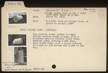 | Description: | Top surface rough-picked to edge. Bottom surface rough-picked, with a finished bearing surface. Beveled dowel cutting. Arrises, with a given spacing, wider at the bottom. Pentelic marble. <graphic> | |