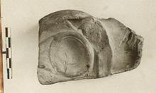 | Description: | Broken at both ends and at back; finished lower edge. Chipped. Part of a large muzzle and eye (?). Good roof tile fabric with smooth buff slip. ADDENDA A spout of an eaves tile? Published as an archetype fragment, a calf's head, the oldest surviving Attic archetype known. | |