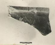 | Description: | Part of one edge preserved of pan (rain) tile. Pale brown clay. Firm red paint on upper surface. Flange worn. Under surface flat. | |