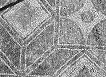 Description:   From the outer border of the floor. Geometric design outlined in black and white against a red background, the individual motives worked in blue, red, green and yellow tesserae.