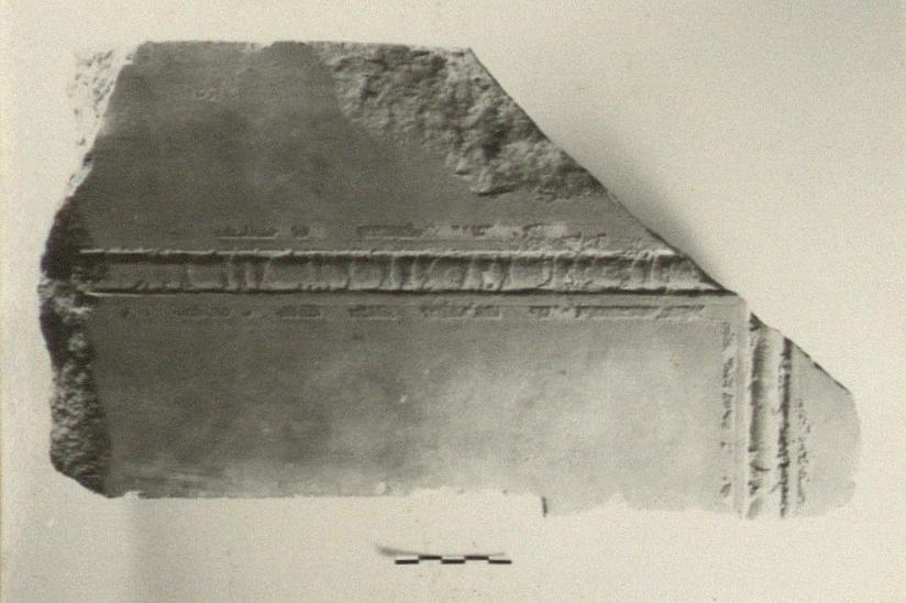 | Description: | a) Rib between coffer, with single astragal. Upper part broken away. Width, coffer to coffer, preserved, and height of coffer face on one side. Rabbet. Return of astragal preserved, but not intersection. Considerable remains of paint, similar in scheme to Temple of Ares ceiling slabs, but different in quality, as though with an oil base rather than with water. b) Corner of slab at end. No setting lines. Paint giving important evidence. Cutting for dowel on bottom at side. From the Temple of Hephaistos. Pentelic marble. ADDENDA Probably flank peristyle (CNE, July 1969). | |