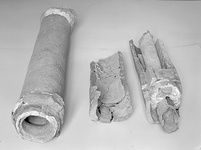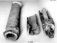 | Description: | a) Mended from many pieces, broken off and cracked; contains a lead pipe. No leading. b) The joints are cemented and bound with lead. Water deposit inside of both. Red clay with bits in it. | |
