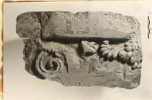 | Description: | Mended from two pieces. Broken at top, right and back; cracked; front much battered. Floral decoration in relief; red background. Maeander painted in red on lower fascia. On back, near original left end a deep groove and part of a similar one beside break at right. Distance between them ca. 0.15m. From Middle Stoa. Same series as A 554, etc. | |