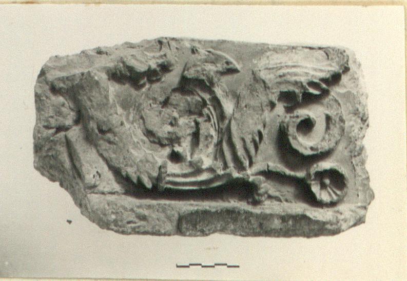 | Description: | Broken right, left, below and behind. Fragment from upright part of sima with tendrils in high relief. Slight traces of color. Coarse purplish brown clay with bits. From Middle Stoa. | |
