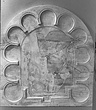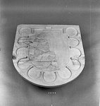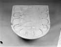 Description:   About one half preserved, mended. Horseshoe shaped slab, smooth on bottom, with a broad raised surface around the edge on top into which are sunk depressions also of horseshoe shape, the rounded side pointing outward.