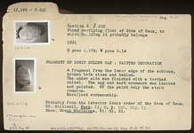 | Description: | a) A fragment from the lower edge of the echinus, broken both sides and behind. The underside was finished with a toothed chisel. The egg and dart ornament was incised and painted. Of the paint only the stain remains. b) A fragment found later, which gives a part of the painted echinus. c) A third fragment, which gives the inner corner of one of the volutes, with part of the small lotus at the spring d) A fourth fragment, which gives part of the inner line of the volutes. e) A fifth fragment which gives part of the outer curve. Excellent workmanship. Marble. Probably from the interior Ionic order of the Stoa of Zeus. Cf. Hesperia 2 (1933), p. 123, fig. 11. For the restored drawing of these fragments, see neg. no. 7-38. | |