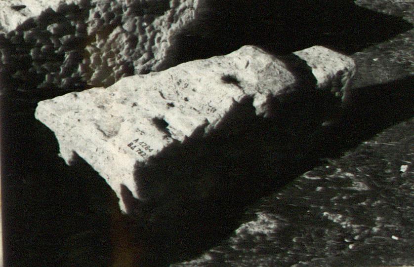 | Description: | Left end of block with "anathyrosis" on left end. Top and back rough-picked. Top seems to slope down toward pear from a point ca. 0.30m. from front. At this point the top is cut down to form a channel with remainder of top surface toward the front slightly higher. Higher top surface has two hook clamp cuttings to left. Front badly water worn. Traces of two leaves and lion head on "sima". Traces of running ivy on corona fascia. From Roman Circular Building, Monopteros, cf. A 638. Pentelic marble. | |