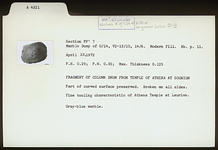 | Description: | Part of curved surface preserved. Broken on all sides. Fine tooling characteristic of Athena Temple at Laurion. Gray-blue marble. | |