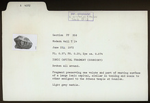 | Description: | Broken all around. Fragment preserving one volute and part of resting surface of a large Ionic capital, similar in tooling and scale to other assigned to the Temple of Athena at Sounion. Light gray marble. | |