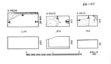 | Description: | Originally one T-clamp at each end (but one broken away) and one at center of back for attachment to a backer block; lengths 0.117m., 0.112m.; heads 0.069m., 0.075m.; depths 0.035m., 0.042m. Anathyrosis at ends on front and top only (top band at left broken away); only top band on back. Recessed bands at bottom and left end, 0.057m. and 0.081m. wide and 0.007m. deep giving finished surface back of protective surface. Top smoothly tooth-chiseled. What seems to be a Δ on top surface. Thorikos marble. From same series as A 4603 (Ι 1743) - A 4608 (Ι 1748) and A 4610 (Ι 1750). | |
