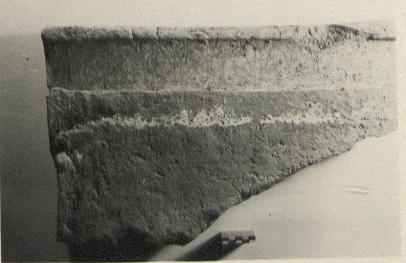 | Description: | Broken behind. Ridges on edges of upper side for cover tile to fit over. On outer face of overhang, maeander in dark paint on light ground. On soffit, palmettes and bud ornament. Gray on white; hearts of leaves dotted with red; the leaves outlined only. Red clay; buff slip. | |