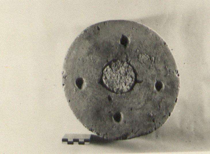 Description:   Thick circular tile with a hole through the center and four, shallow, round indentations on the upper face.