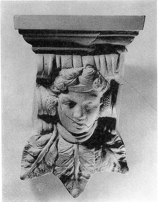 | Description: | Preserved in three joining fragments is the upper right hand corner, except the top, the face entire and the whole lower part. The head, with hair parted and waved, crowned with a diadem and bunches of grapes (so, probably Dionysos) is flanked at either side by a molded console carrying a crowning molding. Dionysos' neck is wrapped in what appears to be a roll of fabric; from this and from the bases of the consoles, depend three large leaves in a spreading trefoil pattern. Fine pinkish buff clay, slightly micaceous, unevenly fired; unglazed. Cf. A 679 (Ι 908). | |