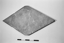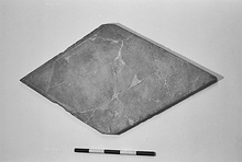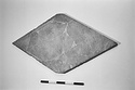 | Description: | A diamond shaped Tholos tile, both points and one of the lateral angles missing. Restored in plaster. Similar to A 856 (Ζ 1532) in shape and fabric. | |