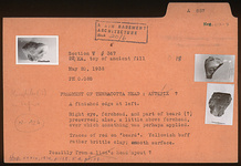 | Description: | A finished edge at left. Right eye, forehead, and part of beard (?) preserved; also, a little above forehead, over which something was perhaps applied. Traces of red on "beard". Yellowish buff rather brittle clay; smooth surface. ADDENDA Initially suggested to be from a lion's head spout but later published as an antefix with head of Herakles. | |