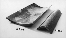 | Description: | Dimensions fully preserved; much of one side, and middle, missing; made up in plaster. Laconian type. Coarse pinkish-brown clay; red to black glaze wash on concave face. | |
