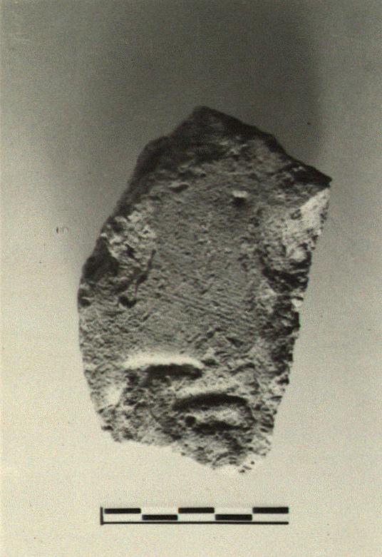 | Description: | From a flat roof tile. Part of a swastika-like stamp preserved on the unglazed under surface. Black glaze on the upper surface. Coarse red clay. | |