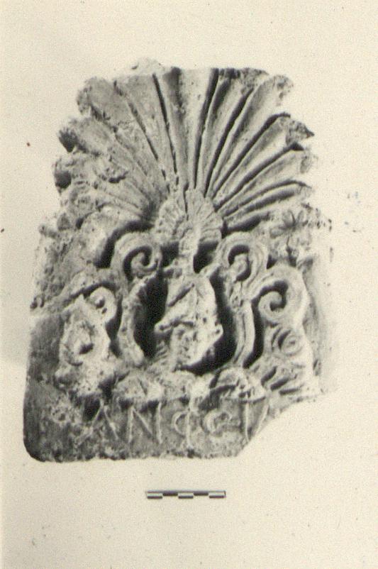 | Description: | Tip and lower right corner missing. In high relief on face a head of Athena in Corinthian helmet, flanked by acanthus sprays and supporting a large palmette with a small palmette at its heart and rosettes in its sides. In raised letters across the bottom: Π Α Ν Φ Ε Ι ] <graphic> | |