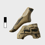 | Description: | Pink clay; black stripes down outside of legs and around waist; chipped; protruding buttocks. | |