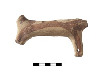| Inventory Number: | | AF 529 | | Title: | | Figurine Fragment | | Category: | | Terracotta | | Description: | | Mycenaean terracotta horse or ox. Lacking head, end of foreleg, tail. Mark of attachment of rider (?) on rump. 2 legged. Hind leg pierced with hole. Broad red-brown stripes. Unpainted on back side. Red clay. Red-cream slip. | | Notes: | | Munsell (fabric) 5 YR 6/4 light reddish brown; (slip) 10 YR 7/3 to 7/4 very pale brown; (paint) 2.5 YR 3/6 dark red | | Context: | | Charles Morgan/B. Gorbe, Nb. No. 17. | | Notebook Page: | | 88 | | Dimensions: | | P.H. 0.069; P.W. 0.027; P.L. 0.131 | | Date: | | 10 May 1934 | | Bibliography: | | Hesperia 4 (1935), p.192. | | References: | | Publication: Hesperia 4 (1935)