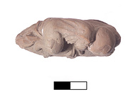 Description:   Terracotta figurine, sleeping child. Outer slip somewhat crumbled. Reddish buff clay, white paint.