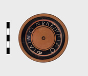 Moulded ring foot. Reserved: resting surface and under- side with glazed band, two circles and dot. Traces of reserved groove above junction of wall and foot. Decoration inside: zone of tongues, circle of enclosed rings formed by two arcs. Ostrakon of Philinos Kleippidou (417 or 415 B.C.).