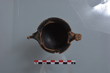 Scraped groove in resting surface; concave underside. Scraped groove at junction of stem and body. Low concave stem. Scraped groove below lower handle attachment, with area above it ribbed. High upper body. Handle joins below rim. Very thin walls. Peeling, black glaze, stacking circle; miltos.