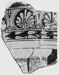 Upper parts of two Doric columns, one column slightly behind the other. Each column has a necking ring decorated with an egg pattern. Above, laurel wreath to right, then a zone of upright encircled palmettes and lotuses. Relief contour. Dilute glaze: flutes of right column.