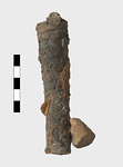 Rectangular handle; broken all around. Square top of handle with bronze head. Circular socket, long and hollow; cracked longitudinally. Ring around the top edge of the socket. Several other pieces of iron found with it.