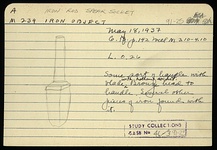 Rectangular handle; broken all around. Square top of handle with bronze head. Circular socket, long and hollow; cracked longitudinally. Ring around the top edge of the socket. Several other pieces of iron found with it.