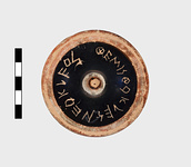 | Description: | Kylix base with black glaze. Red on the top. Inscribed on bottom. Part of stem of kylix. | |