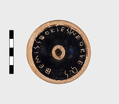 Description:   Kylix base with black glaze. Portion of base preserved. ΘΕΜΙΣΣΘΟΚΛΕΣ and Ω in ΝΕΟΚΛΕΩΣ. Inscribed on bottom.